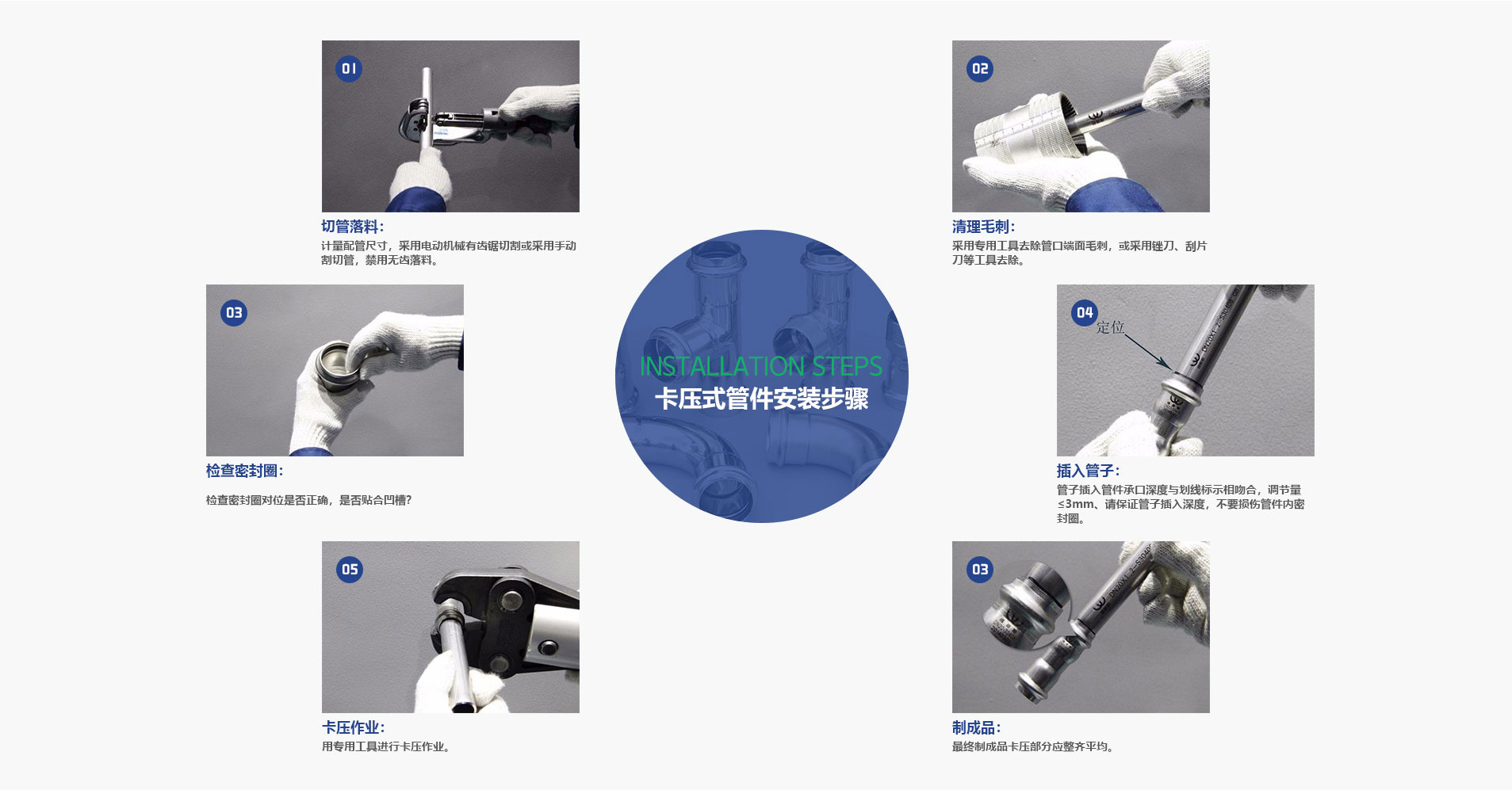 8、安裝簡(jiǎn)便:將管子插入管件后用專用的工具卡壓到位即可,比傳統(tǒng)的焊接或者絲接口簡(jiǎn)便。